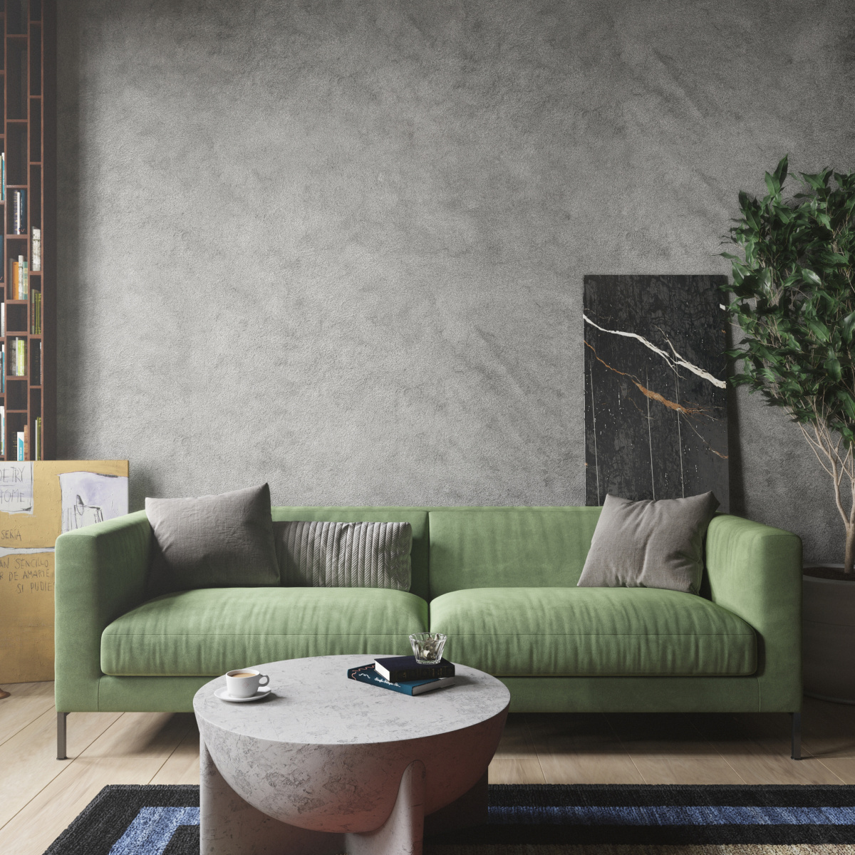 Замша — фоновый материал, в который здорово добавлять акценты. Например, деталь из бетона добавит объема и контрастна в интерьер.