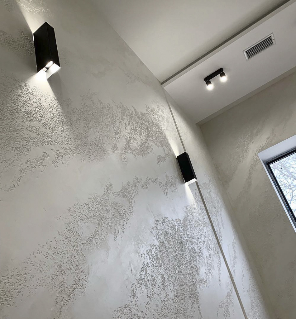 Выраженного рельефа проще всего добиться с помощью штукатурки GD-41 “Травертин” — это натуральное известковое покрытие. Травертин применяют для создания фактурных покрытий без швов и соединений на стенах. При нанесении можно делать разные узоры. Самые популярные — карта мира и имитации натурального камня.