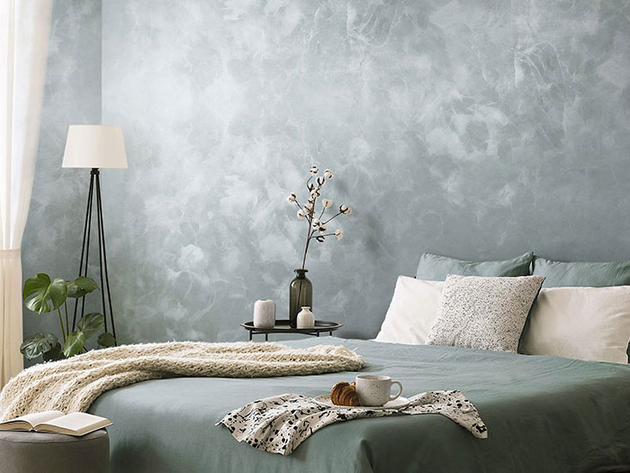 Шелковая штукатурка с эффектом перламутрового блеска в интерьере спальни