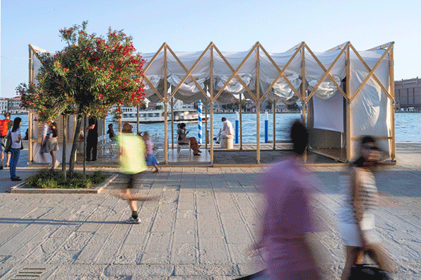 Складной уличный кинотеатр в Венеции — динамичная конструкция, где ткань стала основным материалом для стен:
