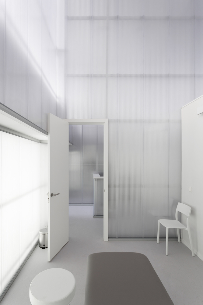 В проекте испанской физиотерапевтической клиники архитекторы использовали белые матовые панели для внутренних перегородок, чтобы создать спокойную атмосферу для пациентов.
