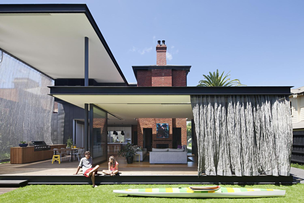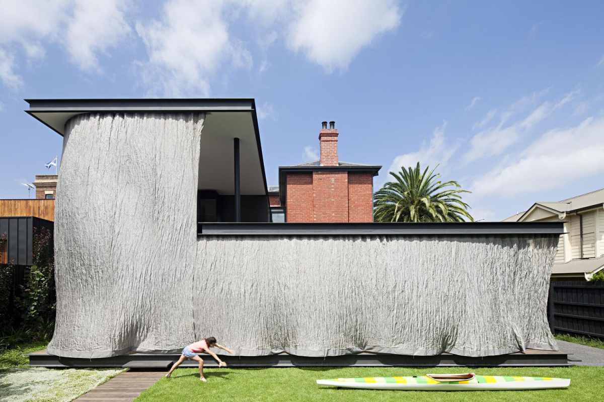 Текстильные фасады используют для жилых домов в жарких странах. Например, студия Matt Gibson Architecture + Design выбрала полупрозрачный занавес для защиты открытой террасы австралийского дома от палящего солнца: