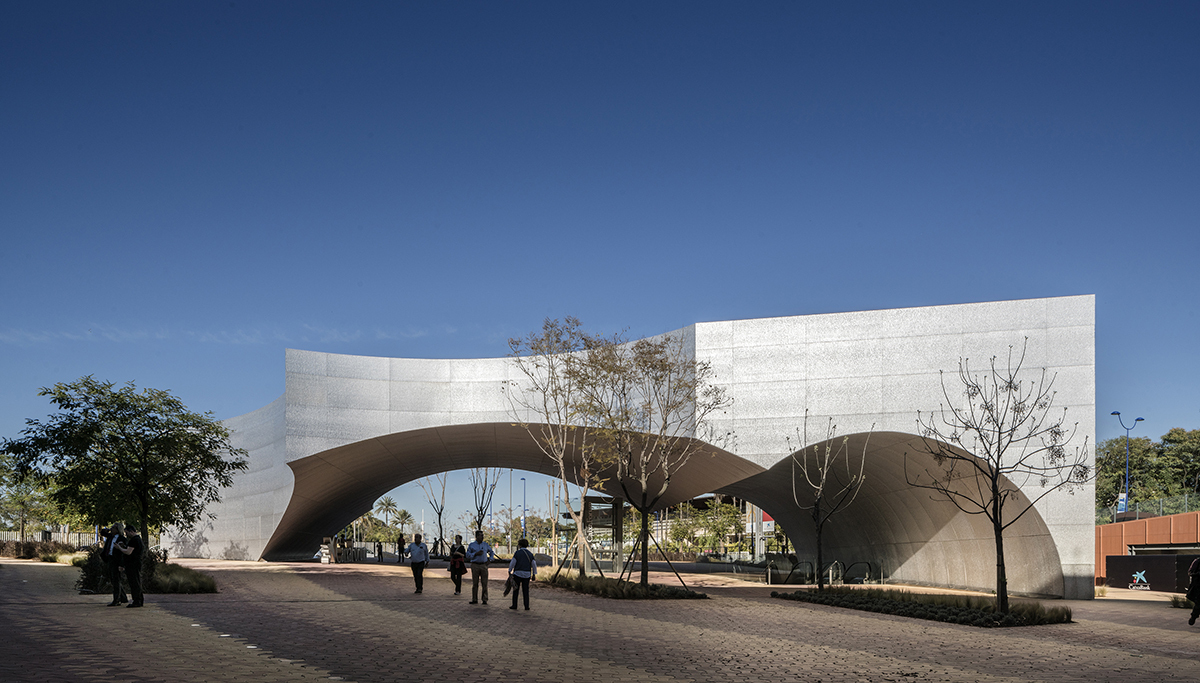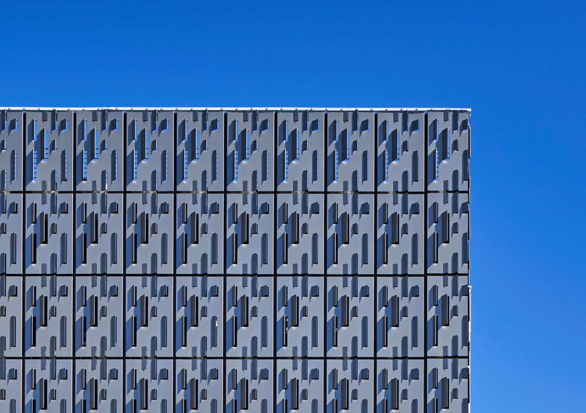 Как и в других проектах здесь перфорация обеспечивает вентиляцию и тень. Панели на 100% подлежат вторичной переработке, их легко монтировать и снимать.