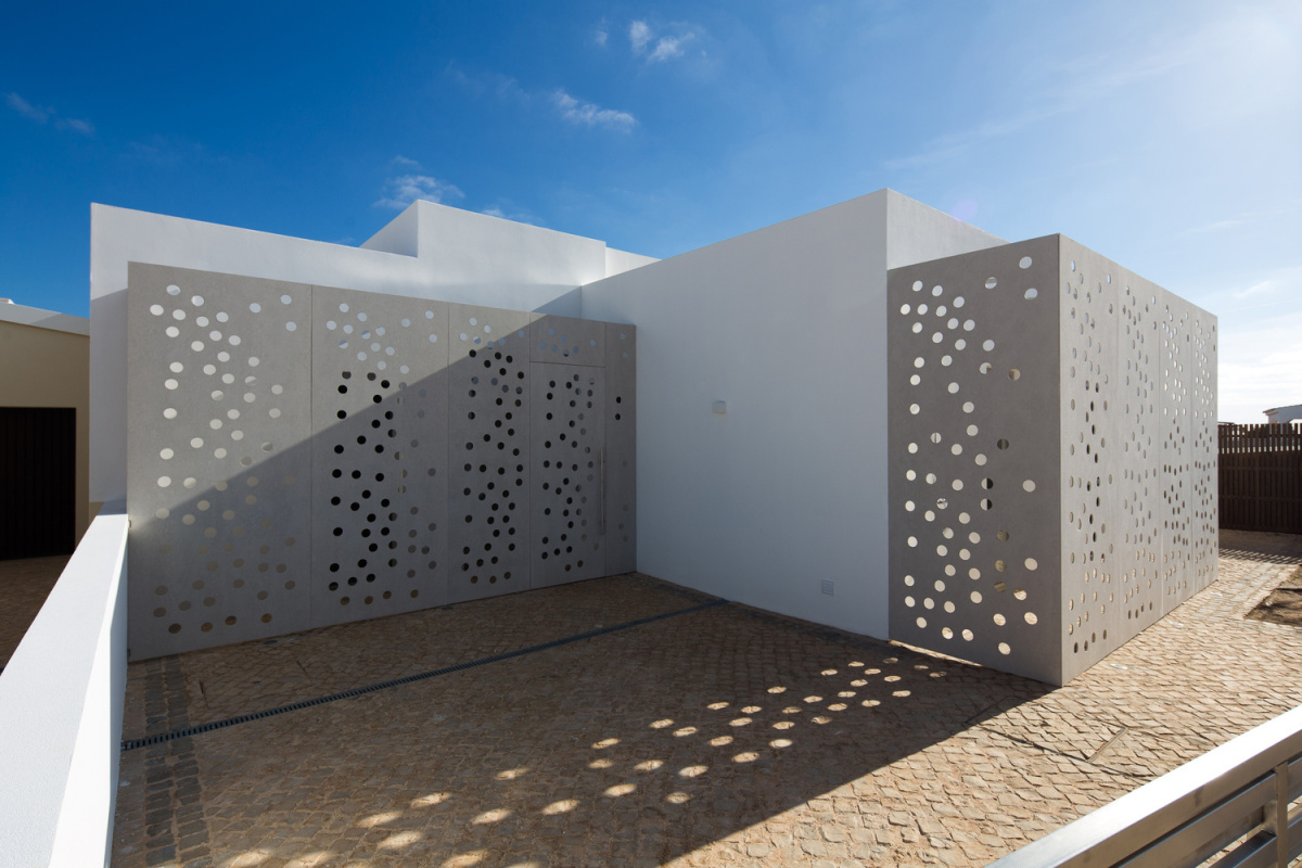 Фиброцемент легко перфорируется. Это свойство использовали в португальском проекте Villa GK для создания теневых зон: