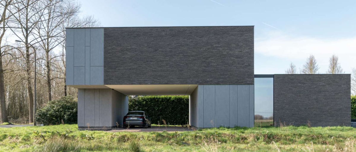 Для глухого фасада бельгийского дома DE BAEDTS авторы выбрали фиброцемент двух оттенков с разными текстурами.