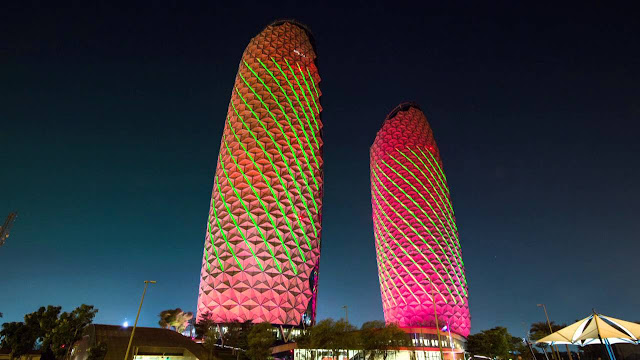 Башни Аль-Бахар в Абу-Даби, ОАЭ — одно из самых известных зданий с механическим фасадом. Панели похожи на зонтики: они раскрываются под солнечными лучами, защищая интерьеры от жары и бликов.