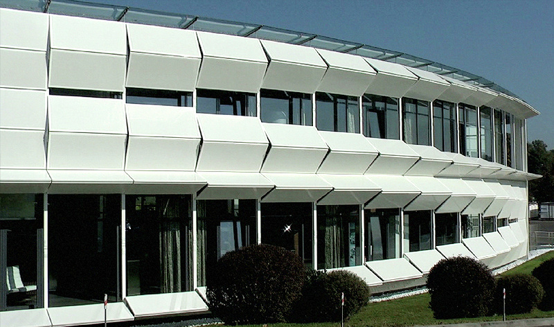 Похожий принцип использовали в проекте австрийского выставочного зала Kiefer Technic. Металлические плиты реагируют на движение солнца. Также панелями можно управлять изнутри здания, адаптируя фасад под свои предпочтения.