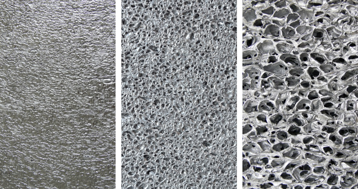 Алюминиевая пена — очень легкий материал, которые на 100% подлежат вторичной переработке. Чтобы получить панели, в расплавленный алюминий нагнетают воздух. Внутри металла находятся керамические частицы, которые и стабилизируют пузырьки воздуха.