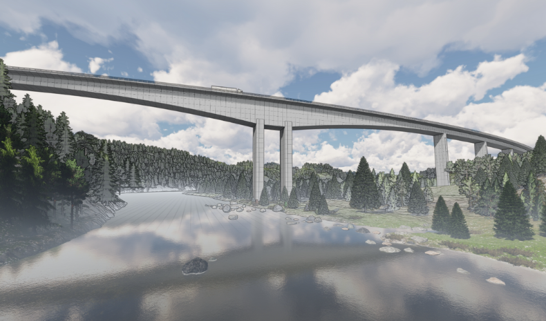 Консольный бетонный мост длиной 634 метра находится в 50 км от Осло, рядом с городом Хёнефосс. 70% элементов моста основываются на параметрическом дизайне. В BIM были спроектированы 200 000 арматурных стержней и 250 тросов постнатяжения.