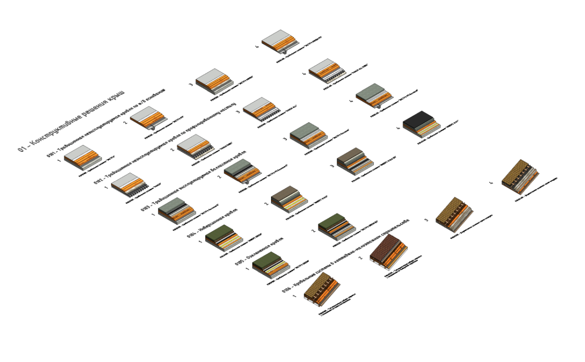 — 104 стиля многослойных материалов (системных решения) по конструктивам: плоские и скатные крыши, стены, фундаменты, основания;