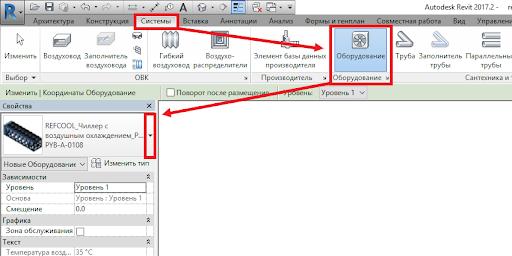 Для размещения моделей необходимо перейти на любой из видов, далее - на панели управления перейти во вкладку «Системы», после чего кликнуть по плитке «Оборудование», и в панели свойств выбрать нужную модель и разместить ее так, как необходимо.