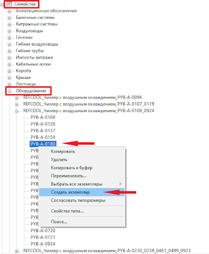 Также можно перейти на любой из видов, в диспетчере проекта во вкладке «Семейства», в категории «Оборудование» кликнуть правой кнопкой мыши на семействе и выбрать «Создать экземпляр», после чего разместить его так, как необходимо.