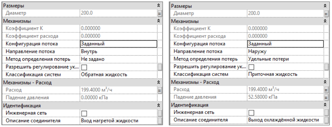 Ниже настройки соединителей: слева соединитель верхнего патрубка, справа — нижнего. Потери на теплообменнике заданы на соединитель подающей линии.