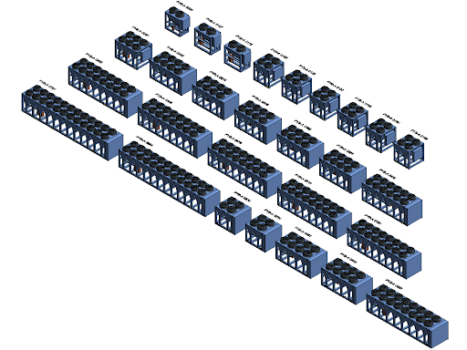 Семейства сделаны максимально удобными для пользователей. Всего существует 28 типоразмеров чиллеров: ширина может быть 1300, 1400, 2150, 2380 мм, высота — 2350, 2458 мм, а длина варьируется от 2450 до 11955 мм. В результате можно подобрать оборудование с холодильной мощностью от 120.2 до 1195.2 кВт.