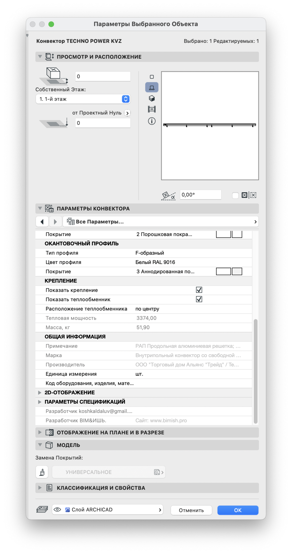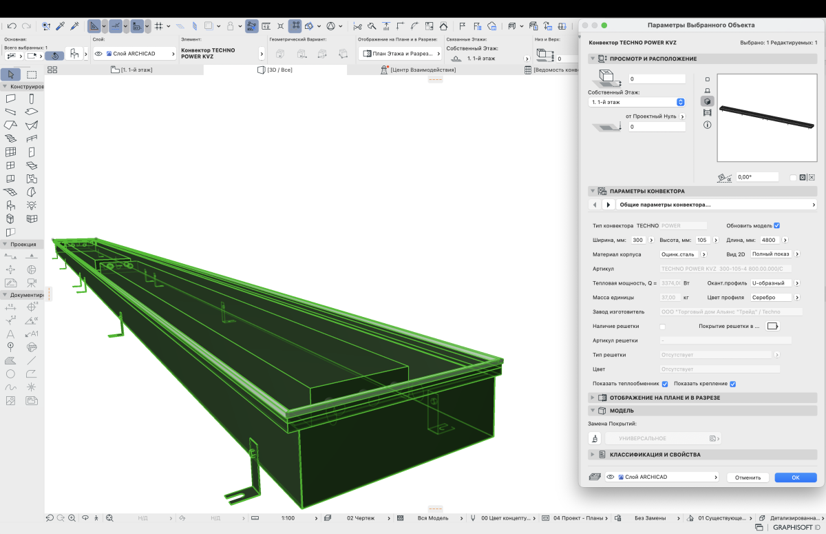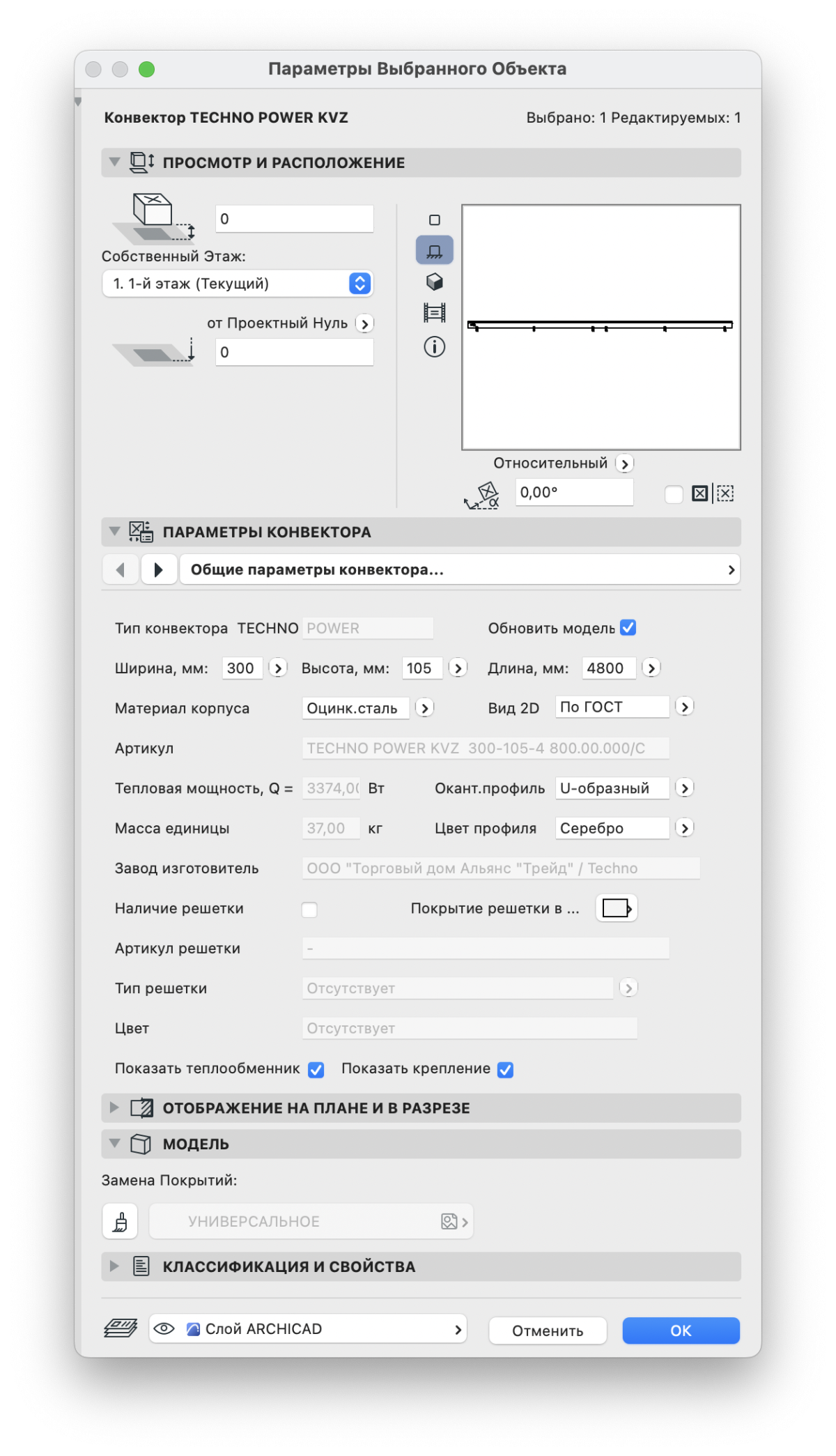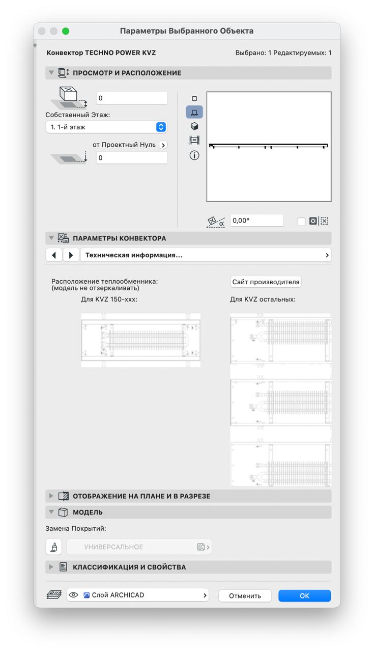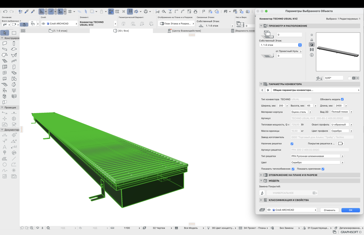 Чтобы исключить ошибку при заказе оборудования, в программе автоматически формируются артикулы конвекторов и решеток Techno. Например, при изменении ширины конвектора, корректируется сама BIM-модель, меняются габариты конвектора и теплообменника, пересчитывается масса конвектора и тепловая мощность.
