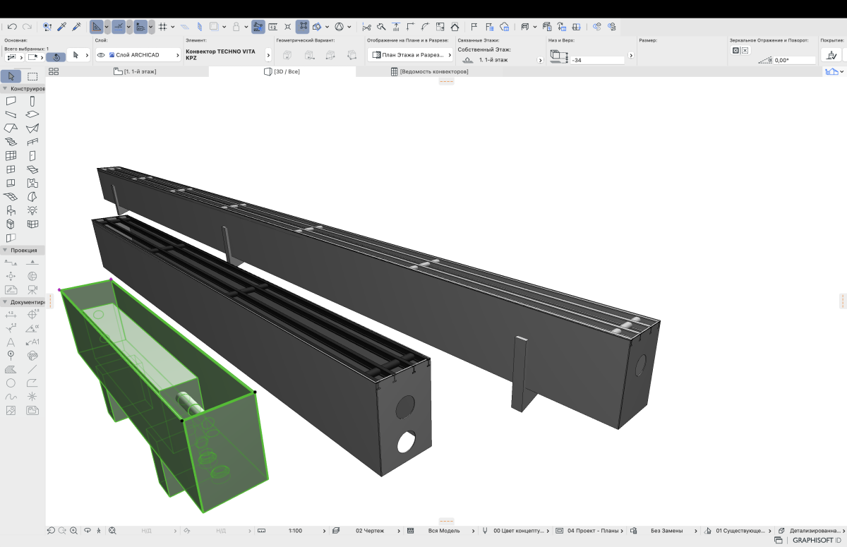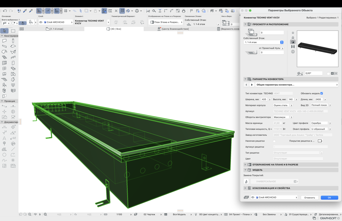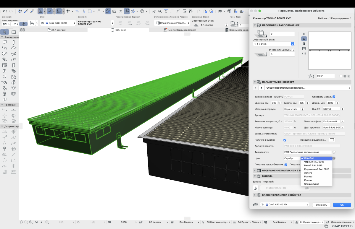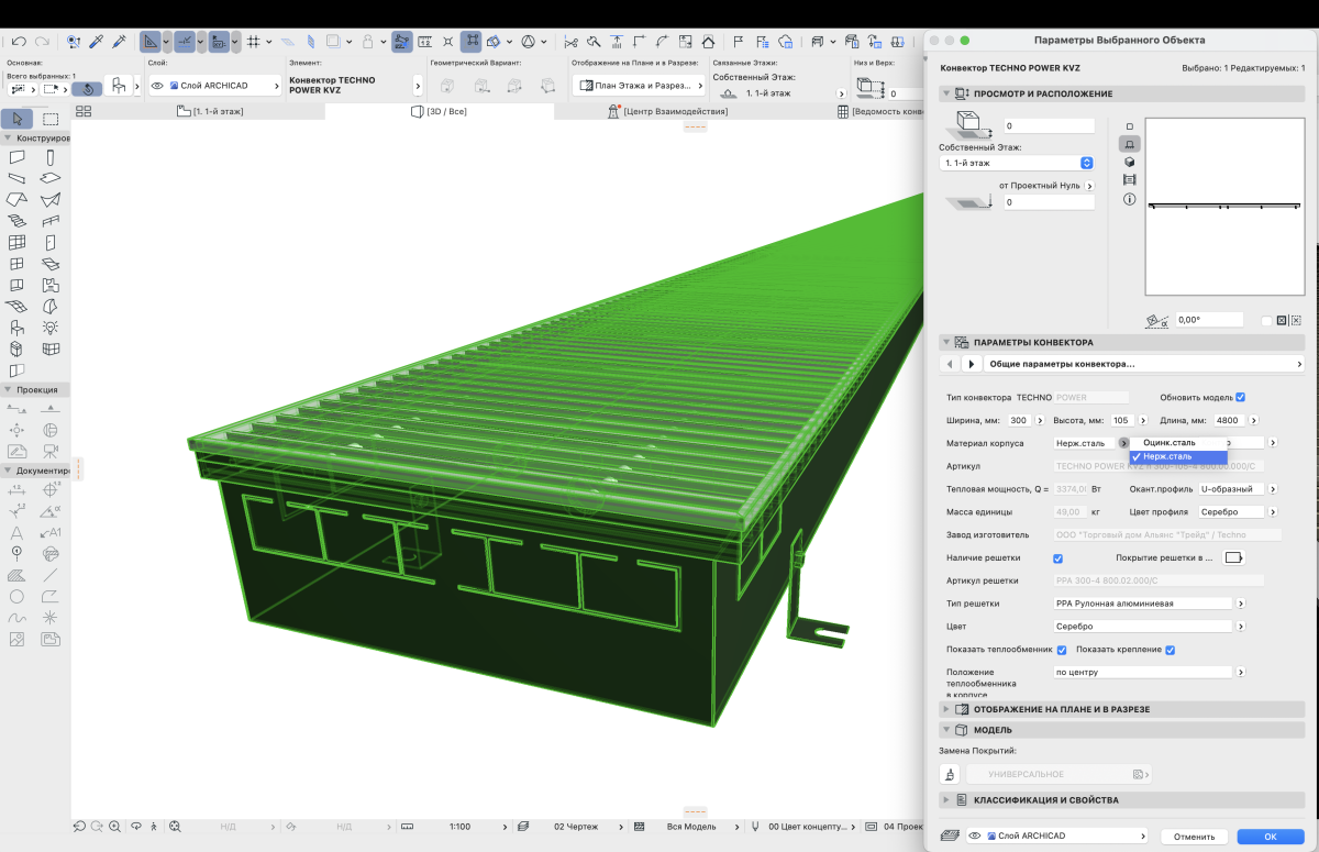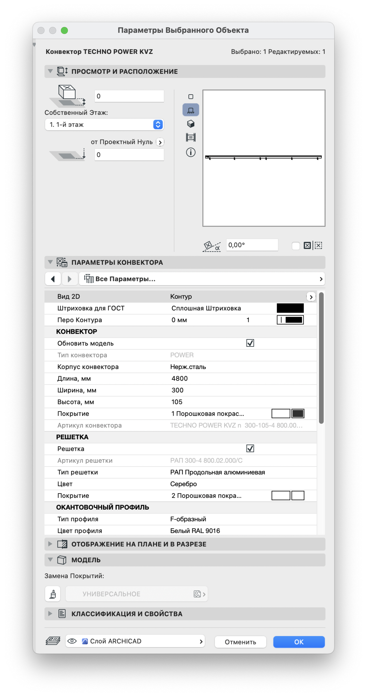 Чтобы исключить ошибку при заказе оборудования, в программе автоматически формируются артикулы конвекторов и решеток Techno. Например, при изменении ширины конвектора, корректируется сама BIM-модель, меняются габариты конвектора и теплообменника, пересчитывается масса конвектора и тепловая мощность.