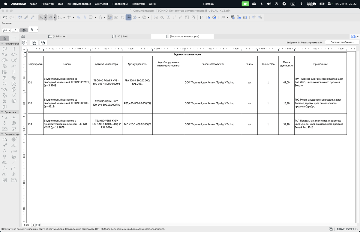 Ведомость оборудования настроена по ГОСТу. В ней отображена позиция, маркировка, полное наименование конвектора и решетки, артикул, масса единицы, примечания. Для удобства добавлена расшифровка артикулов конвектора и решетки.
