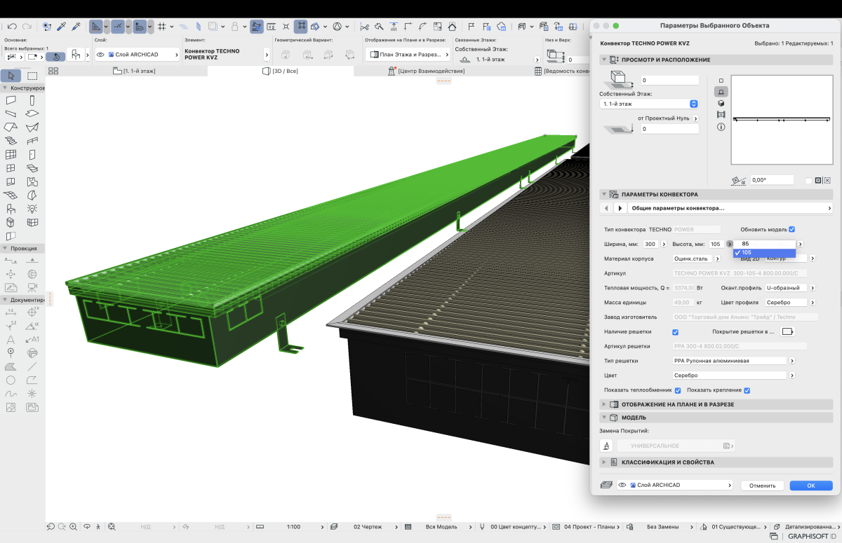 Для изменения габаритных размеров укажите необходимую ширину, высоту и длину. В соответствии с указанными параметрами модель конвектора автоматически изменится на плане и в 3D.