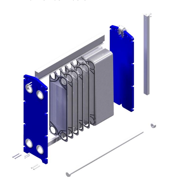 Направляющие помогают сохранить соосность пластин, а задняя стойка служит опорой — сохраняется возможность при сервисе свободно перемещать прижимную плиту, не отсоединяя теплообменник от трубопроводов.
