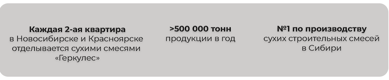 «Геркулес-Сибирь» — лидер по производству сухих и строительных смесей в Сибири. Занимает более 30% рынка в СФО. В производстве «Геркулес-Сибирь» использует высококлассное локальное сырье и европейские стандарты качества. Компания создала свою техническую лабораторию, чтобы вести контроль качества продукции.