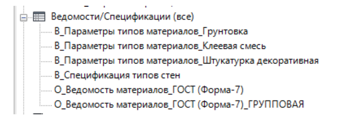 В каталоге разложены все типоразмеры семейств, подготовлены ведомость материалов по ГОСТ и групповая ведомость материалов. В отдельную спецификацию выведены типы стен с параметрами: