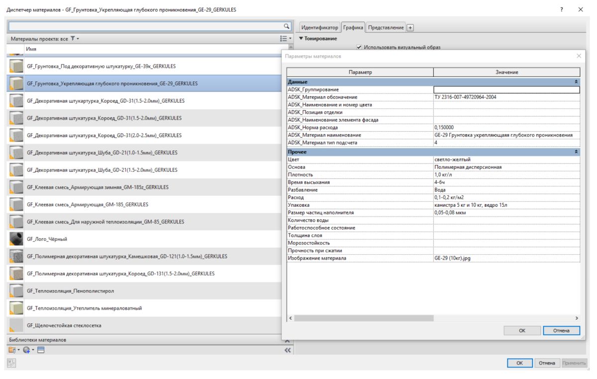 Есть набор материалов, который нужен для вариативной работы с типоразмерами стен. В диспетчере материалов можно посмотреть технические характеристики в разделе «Пользовательские параметры».