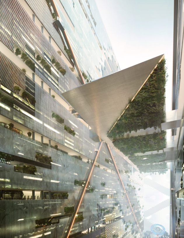 Деревья и кустарники высадят во внутренних парках, на крышах и стенах обоих зданий.