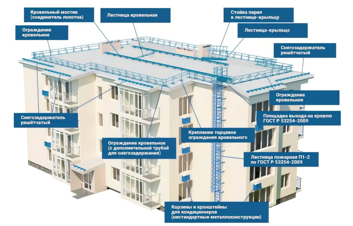 Переходные мостики ГОСТ 58405-2019. Кровельные ограждения. Пожарные лестницы. Маршевые лестницы. ГОСТ-53254