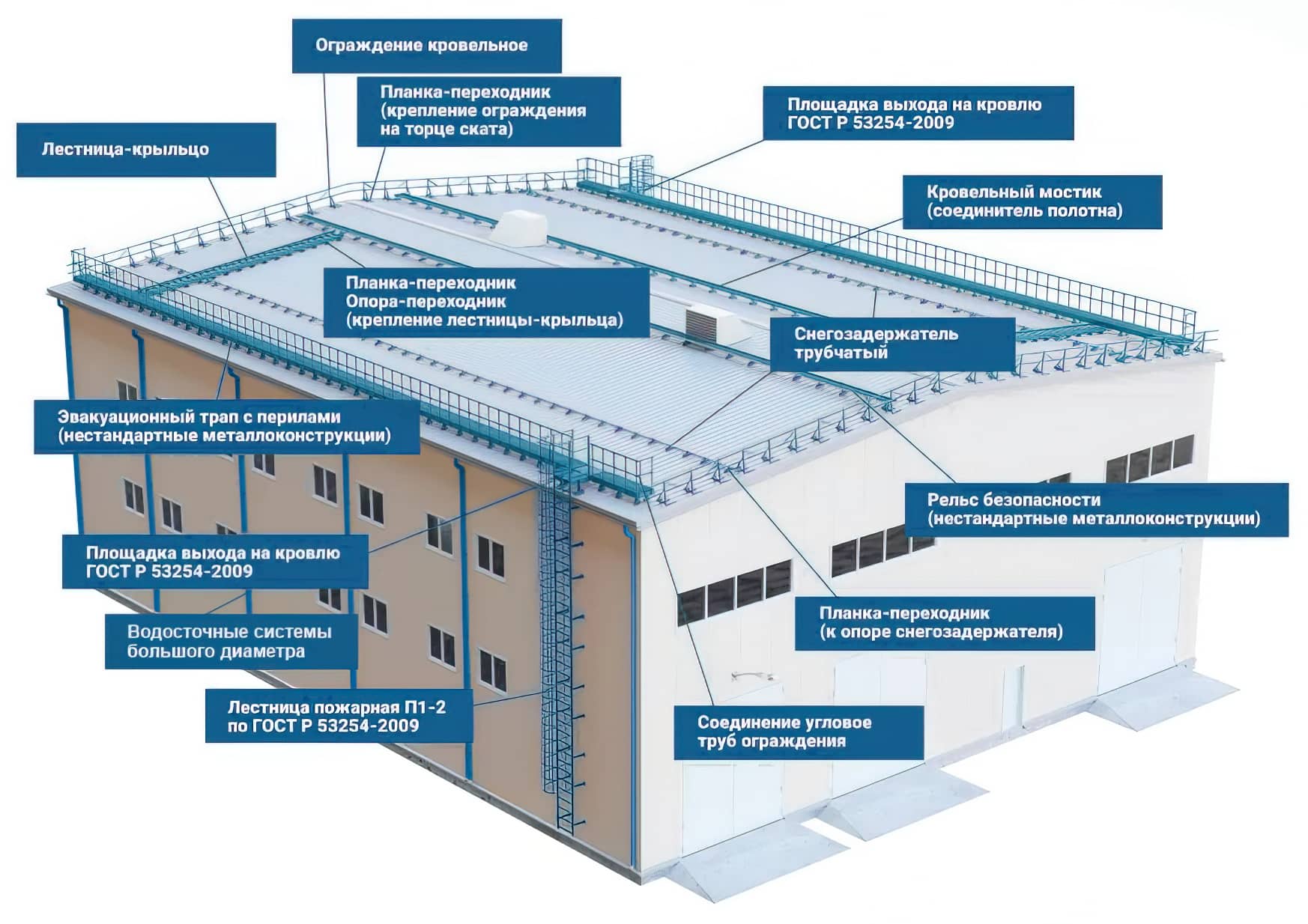 Переходные мостики ГОСТ 58405-2019. Кровельные ограждения. Пожарные лестницы. Маршевые лестницы ГОСТ-53254. Системы промышленной безопасности.