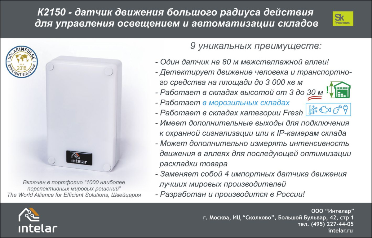 - единственный на сегодняшний день датчик движения в мире, работающий в складах высотой более 12 метров, в охлаждаемых, морозильных складах и складах с особыми климатическими условиями, например, с высокой влажностью воздуха;