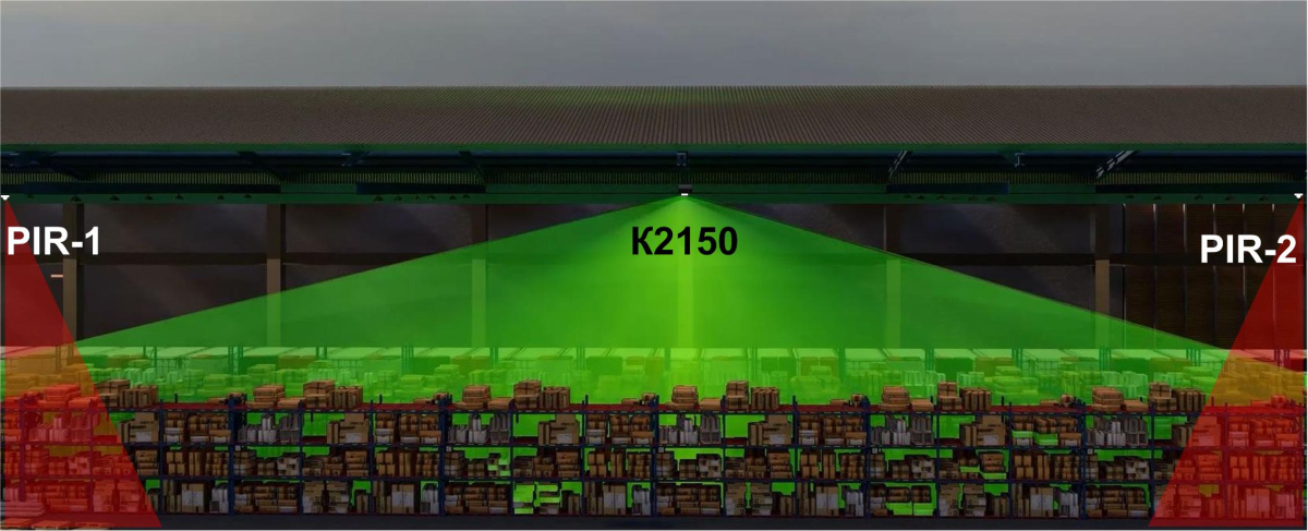 Благодаря высокой чувствительности датчика К2150 и отсутствию «мёртвых зон», достаточно установить задержку на отключение всего 30-60 секунд вместо 10 минут у ИК-датчиков движения, а, значит, получить максимальную экономию электроэнергии на освещении склада. То есть, при использовании ИК-датчиков освещение в пустой аллее (после выезда погрузчика) будет работать ещё 10 минут, а при использовании датчиков К2150 — всего 1 минуту. Разница в 10 раз! Считайте экономию!