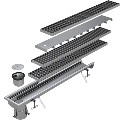 Лоток GRENT PlasT DN100 может комплектоваться пластиковыми, стальными и чугунными решетками в соответствии с требуемым классом нагрузки.