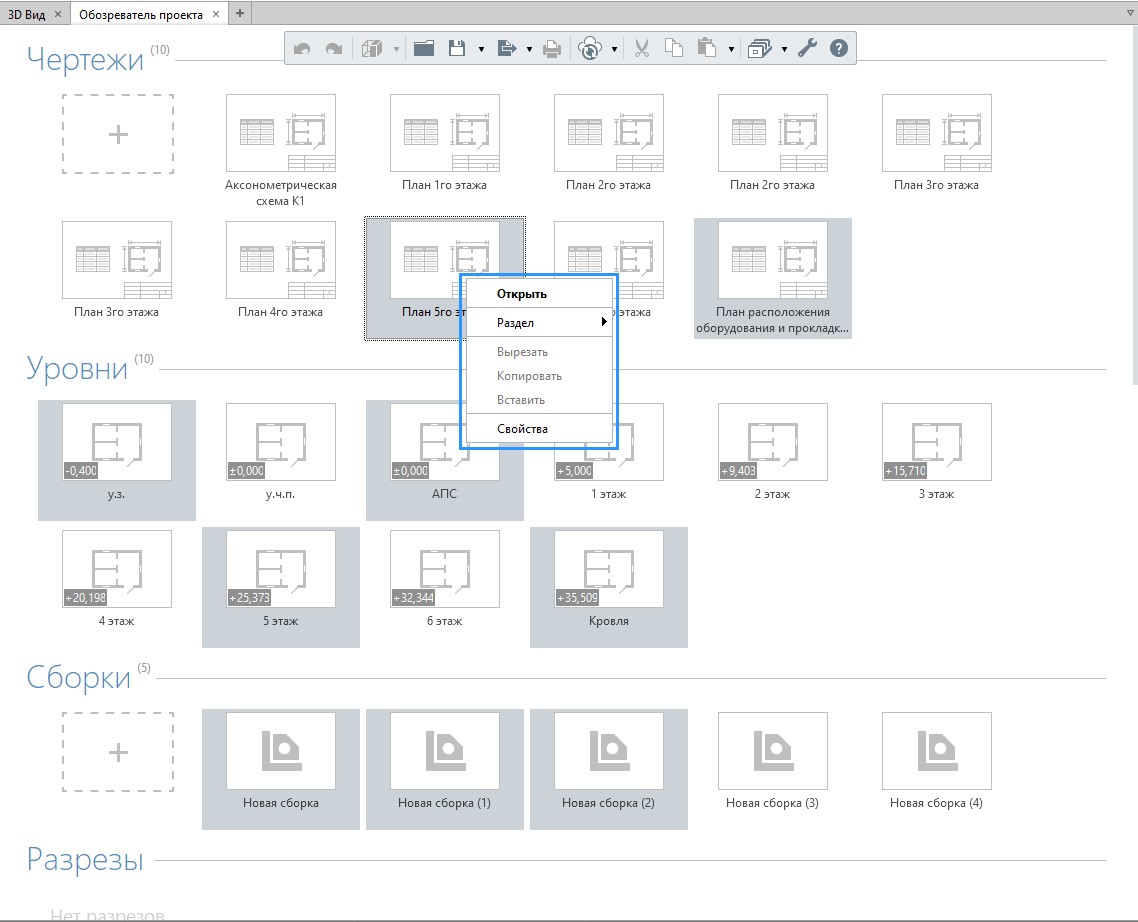 На данный момент задать значение параметра «Раздел» можно следующим сущностям проекта: «Чертёж», «Уровень», «Сборка», «Разрез» и «Фасад», «Спецификация», «Таблица».