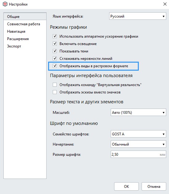 При проектировании крупных объектов и работе с загруженными чертежами возрастает нагрузка на оборудование. В этом случае ради более комфортной работы с чертежами можно включить опцию «Отображать виды в растровом формате». Обратите внимание, по умолчанию настройка выключена.