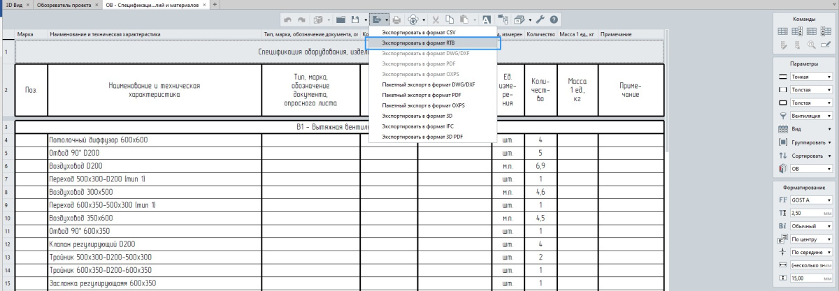 Теперь перейдем к спецификациям. В спецификации стало возможным экспортировать их и создавать из них таблицы. Благодаря им можно, например, отслеживать изменение количества материалов и оборудования в проекте, а затем, составлять сравнительные ведомости.