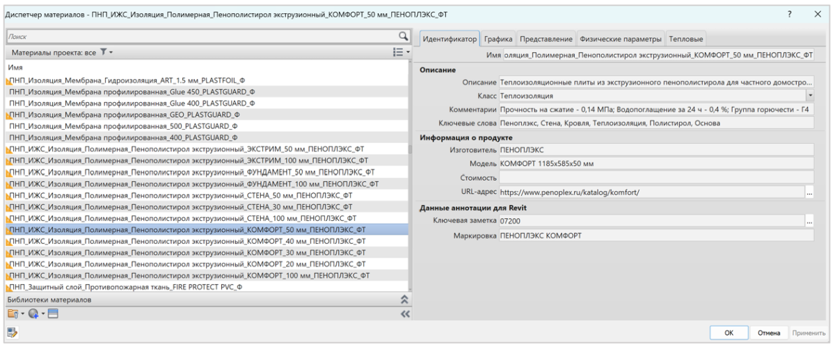 У всех материалов из библиотеки есть префикс «ПНП», для розничных плит Пеноплэкса используется двойной префикс «ПНП_ИЖС». Общее наименование материалов происходит по следующей схеме: Код автора (префикс), категория материала, подкатегория материала, тип материала, марка материала с толщиной, производитель материала, определение наличия тепло и физических параметров. У материалов заполнены физические и тепловые параметры, настроена графика и представление в соответствии со стандартом. В идентификаторе содержится подробное описание материала, а также указаны расширенные параметры, например, для плит ПЕНОПЛЭКС внесены данные: прочности на сжатие, водопоглощения за 24 ч. и группы горючести.