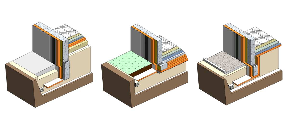 Для моделирования стен цокольных этажей было выполнено моделирование узла с фундаментной плитой. Отображены основные примыкания конструкций. Можно использовать в проекте как узел конструкции целиком, так и скопировать только необходимые элементы. Ниже представлен разрез для решения теплоизоляции стен подвалов и цокольных этажей: