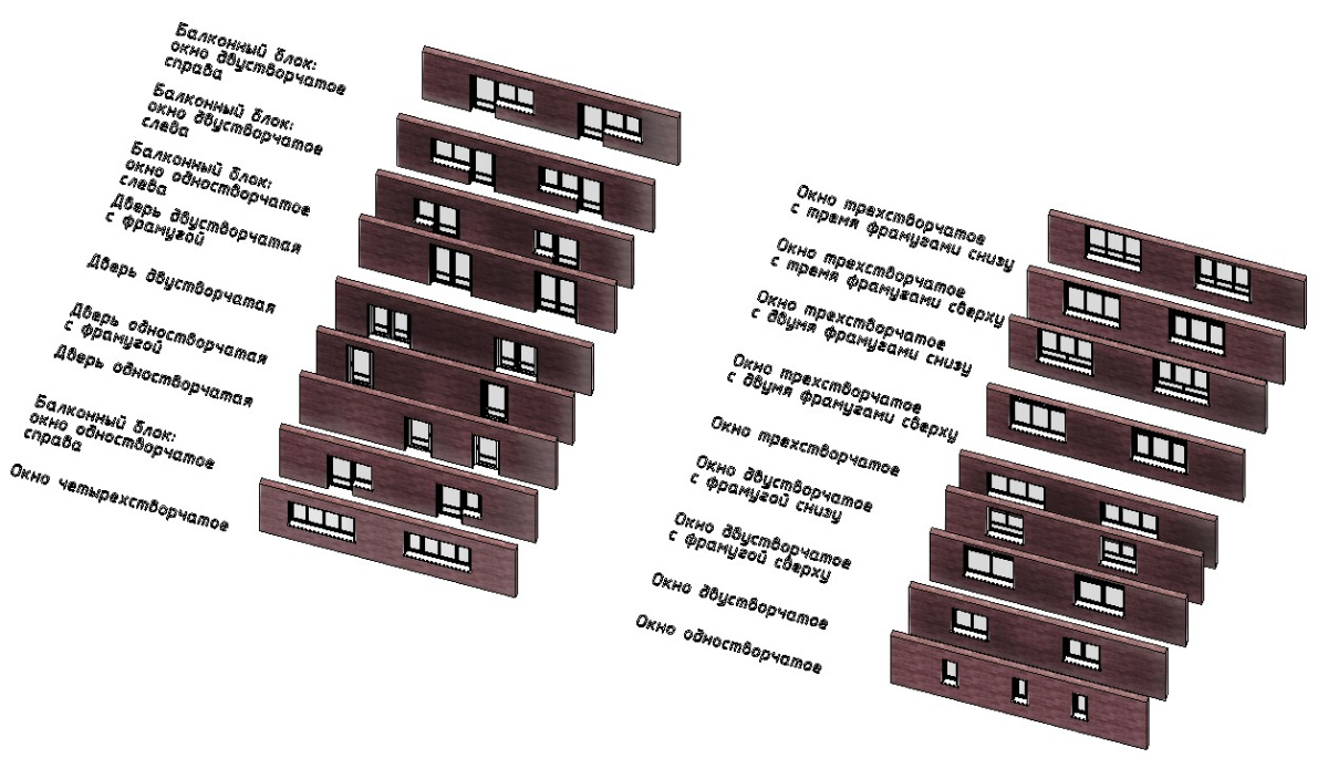Высокая – объёмная модель, с проработанной геометрией и наличием фурнитуры, откосов, отлива и подоконника, средняя детализации – формообразующая геометрия блока со стеклопакетом, низкая – условный проём конструкции в стене. Геометрия поделена на две подкатегории: геометрия оконных и дверных с деталями крепления, УГО – для геометрии условного графического обозначения на чертежах в плане.