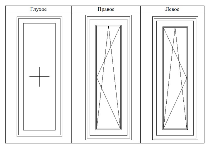Кроме того, для удобного чтения проекта формируются общепринятые эскизные чертежи стеклопакетов, с условно-графическим изображением наличия створки и стороны её открывания, а также её отсутствия для глухого окна.