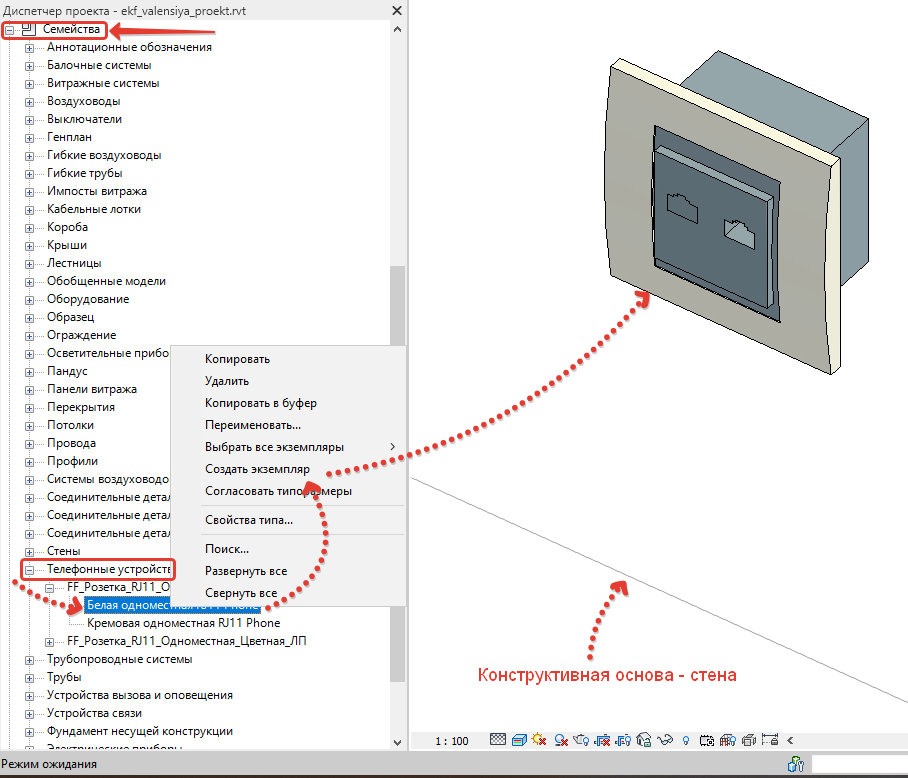 Также можно перейти на любой из видов, для этого в диспетчере проекта во вкладке «Семейства», в категории «Телефонные устройства» кликнуть правой кнопкой мыши на семейство и выбрать «Создать экземпляр», после чего разместить его так, как необходимо.