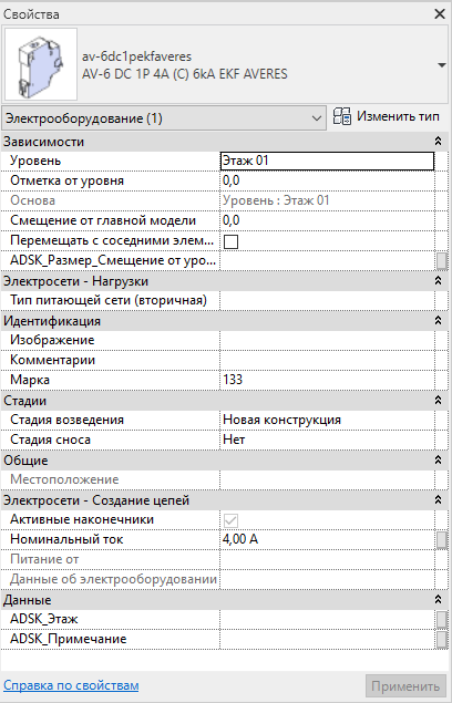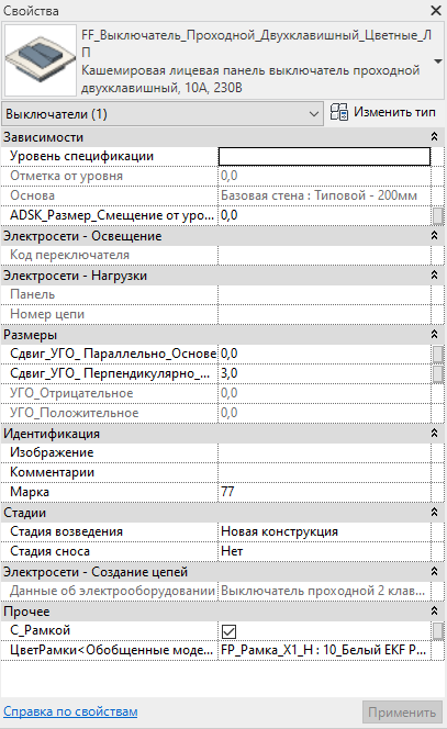 Все семейства в рамках проекта должны располагаться на конструктивной основе, например, на стене. Каждый прибор позиционируется на грани стены в двух координатах: по высоте и длине стены. Пользователь, выделив любой прибор, может сразу же увидеть параметры подключения к силовым электросетям (зелёная метка), где указаны электрические мощность и напряжение прибора.