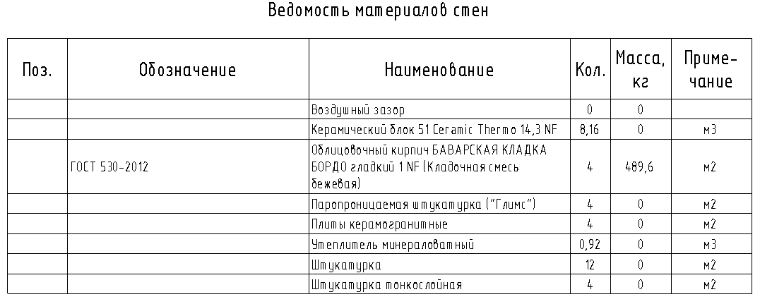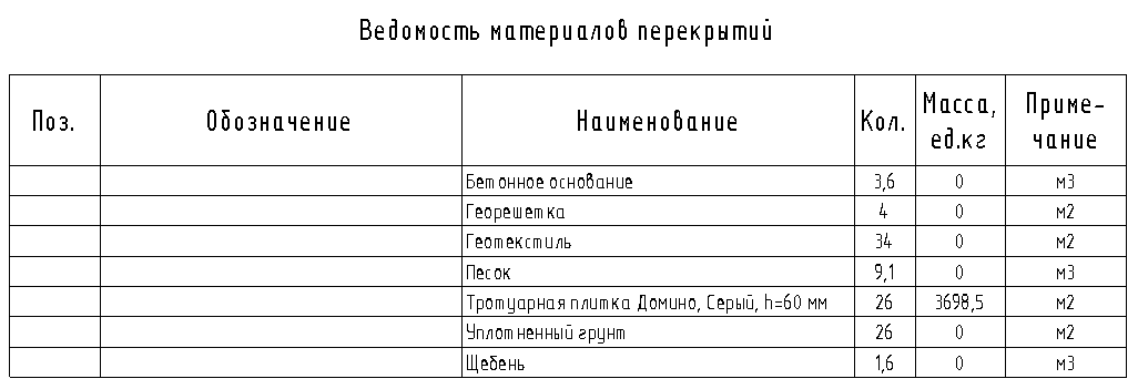 Вся техническая информация о материалах доступна для копирования в ведомость материалов по форме №7 по ГОСТ для каждого «пирога», например, конструкции дорожного покрытия или кирпичной стены. Ведомость автоматизирована и пересчитывается в зависимости от изменений площади конструкции или её состава.
