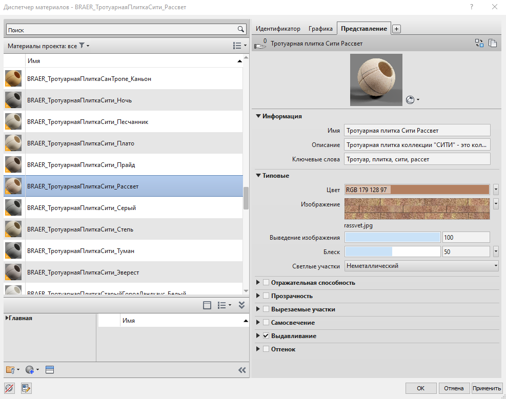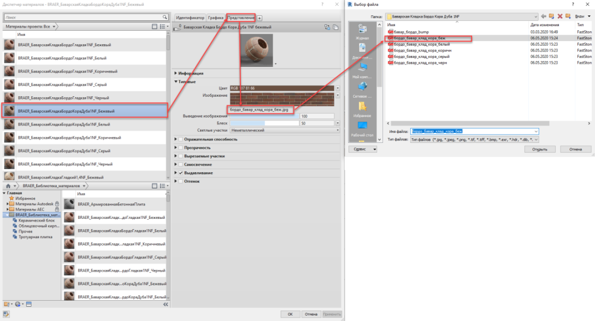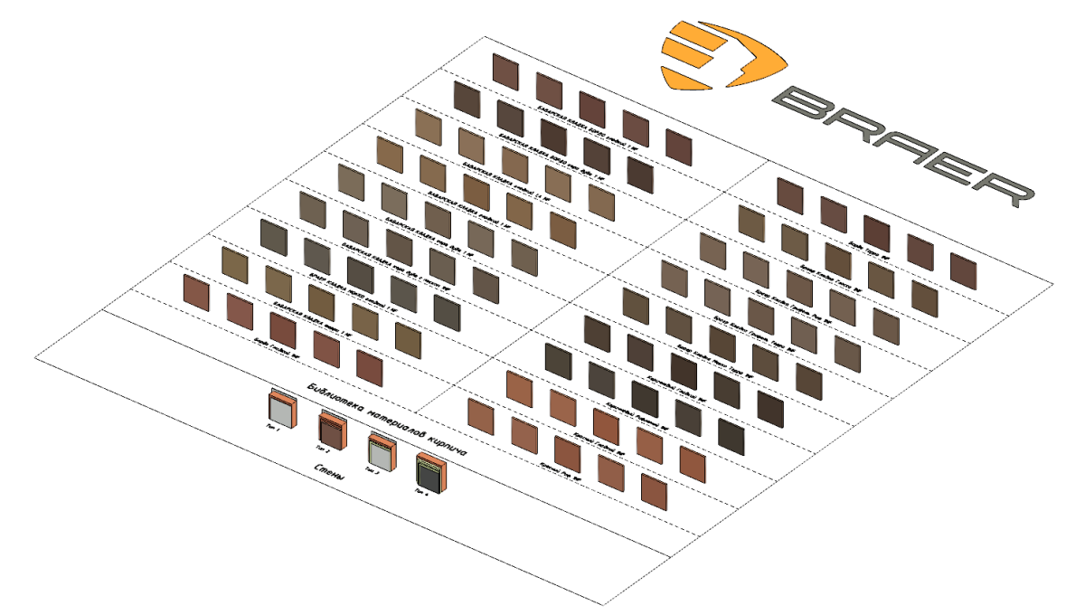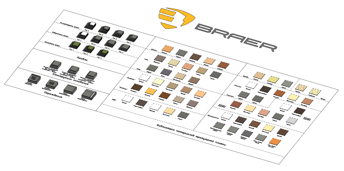 В библиотеках разработаны все необходимые отделочные материалы систем BRAER для формирования многослойных конструкций. Все материалы применяются в моделях кровли и дорожного покрытия, кирпичных стен. Библиотека материалов содержит визуальное представление, идентификаторы (информация о классе материала, его изготовителе со ссылкой на официальный интернет-ресурс, а также описание).
