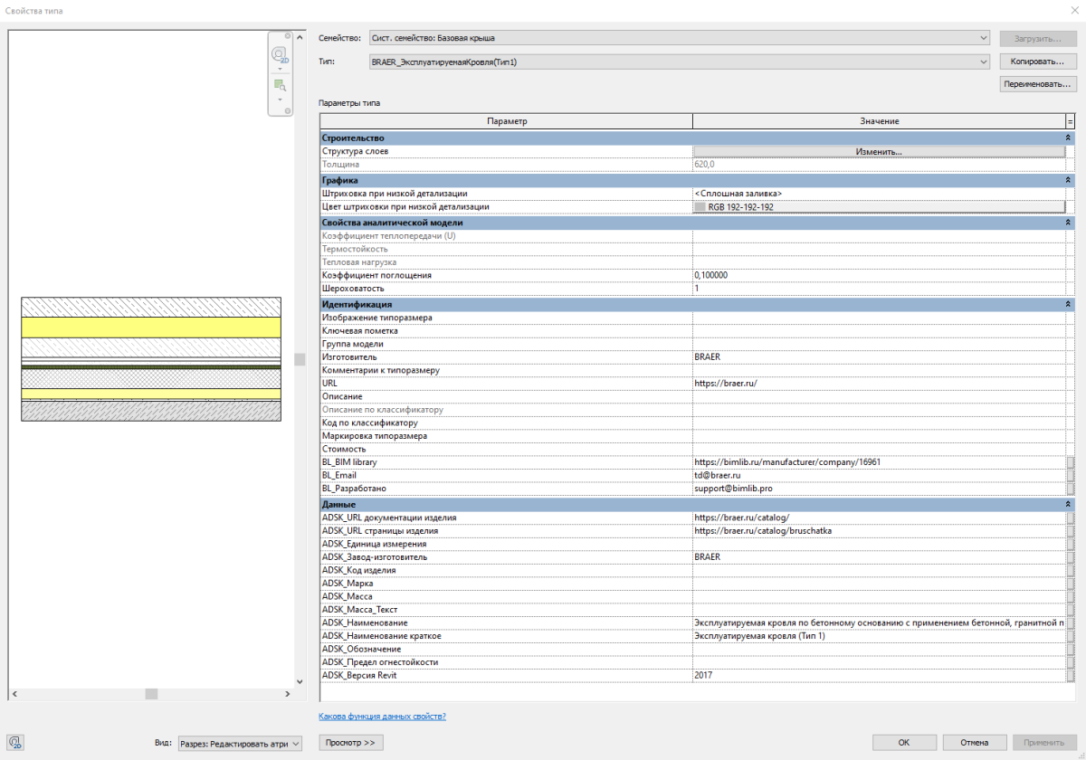 Разработчики сделали BIM-модели семейств BRAER удобными для всех категорий пользователей. Во все многослойные конструкции внесены, кроме технических характеристик теплостойкости, коэффициента теплопередачи, шероховатости, поглощения и т.д., внесена справочная информация и url-ссылки на документы, сайт и данные о производителе, а также описание цветовых решений. В выпадающих списках с пометками «Семейство» и «Тип» пользователь может выбрать определенную категорию конструкции и подходящий по нужным характеристикам «пирог» для неё. Пользователь также может изменить состав конструкции через раздел «Структура слоёв» и материал – через библиотеку.