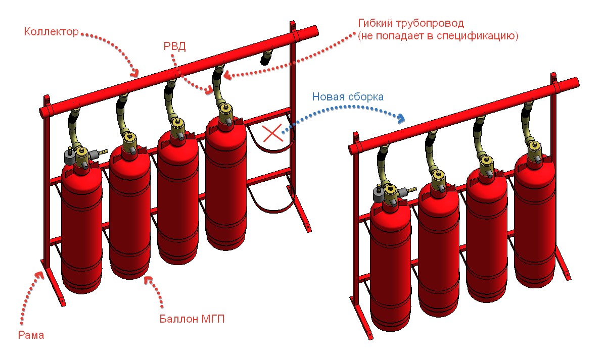 Пользователю также представлены готовые примеры сборок. С помощью них можно понять логику и проанализировать специфику подключения оборудования в сборке. Сборку можно также менять, удаляя ненужные модули (баллон МГП) и их аксессуары. Далее, меняя в свойствах рамы РMN параметр «Nб» – количество баллонов в ряду, меняется структура рамы, например, с 4-х до 5-ти баллонов, а коллектор рамы в этом случае изменится автоматически.