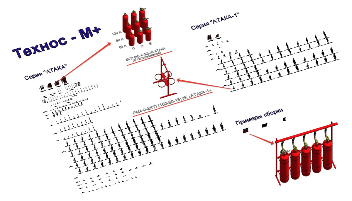 - 42 типоразмера модулей газового пожаротушения (МГП), в обычном или взрывозащищённом исполнении, вместимостью от 10 до 140 литров;