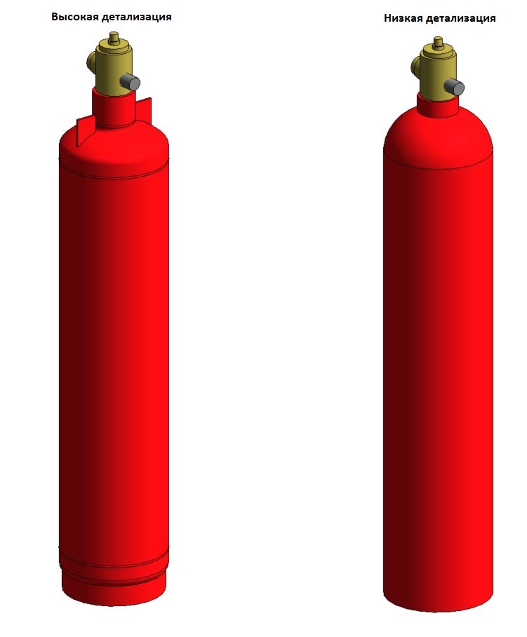 - Модули газового пожаротушения выполнены в 2 степенях детализации, где высокая степень детализации представляет из себя объёмную модель с проработанной геометрией, а низкая степень детализации – упрощённую. Средняя степень детализации совмещена с низкой степенью.