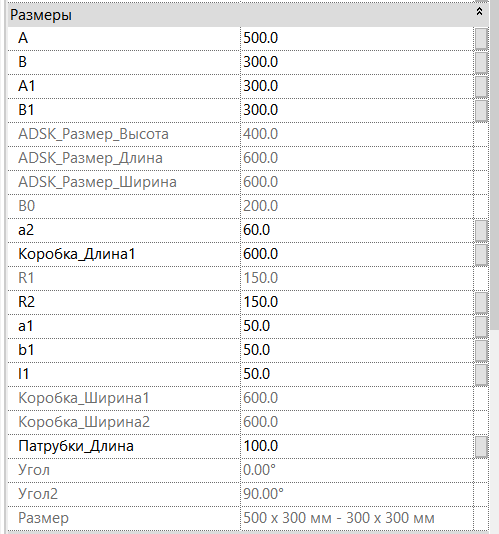 Разработанные семейства, максимально удобны в использовании в проекте. Кроме автоматически подстраиваемой геометрии элементов под трассы воздуховодов, реализована возможность изменения размеров исходя из заданных параметров.