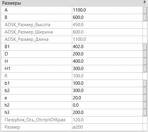 Наименования параметров, отвечающие за геометрические размеры элементов, соответствуют наименованиям в каталоге оборудования. Управляя этими размерами, проектировщик сможет создавать необходимую для себя конфигурацию.
