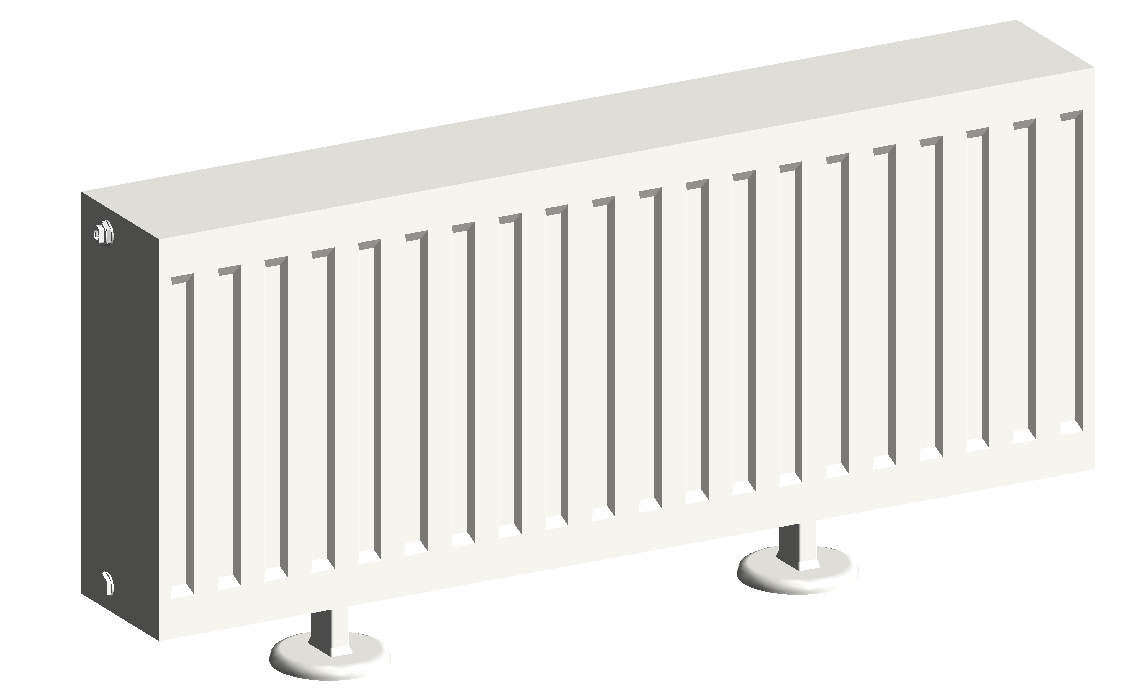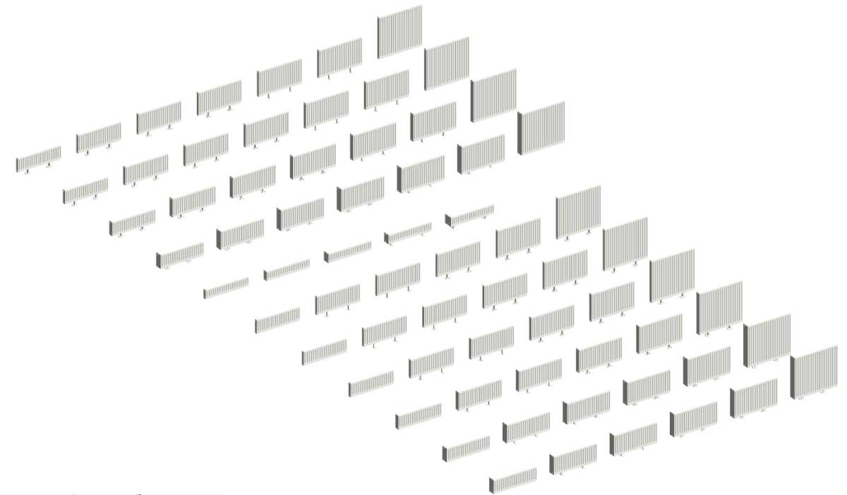 Семейства сделаны максимально удобными для пользователей. Всего реализовано 69 типов стальных панельных радиаторов отопления с возможными значениями высоты прибора от 200 до 900 мм и ширины от 60 до 152 мм, длина приборов варьируется от 400 до 3000 мм. В пространстве модели для наглядности, в качестве примера, размещены радиаторы отопления с разными вариантами крепления. Причём, в свойствах семейства можно выбрать тип крепления или оставить приборы без крепления. В результате можно подобрать радиаторы отопления в зависимости от требуемой тепловой мощности. Также пользователю в интерфейсе семейства доступен выбор моделей кронштейнов и накладок для непосредственного крепления прибора на месте установки. Все детали крепления имеют различные типоразмеры и необходимые параметры для их выбора.